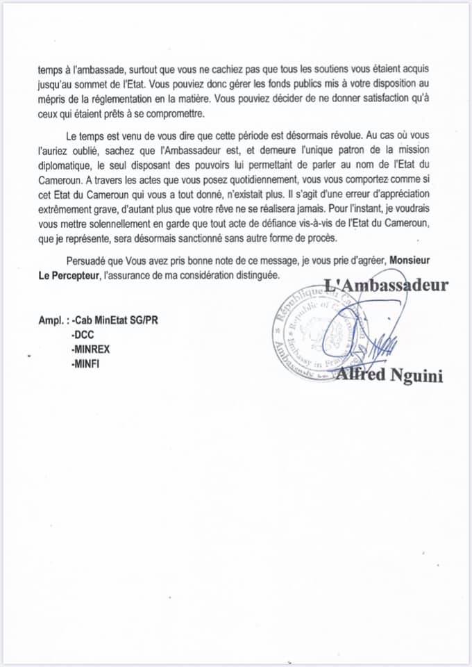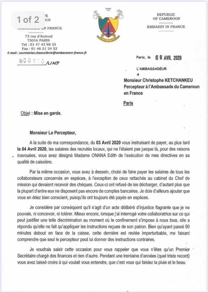 Ce jour, Alfred Nguini est passé la vitesse supérieure en adressant un violent courrier daté du 9 avril 2020 dont j’ai pu obtenir copie à Ketchankeu le percepteur de l’ambassade en poste depuis 1984. Il lui rappelle qu’il n’est qu’un petit percepteur et va lui faire sa peau.