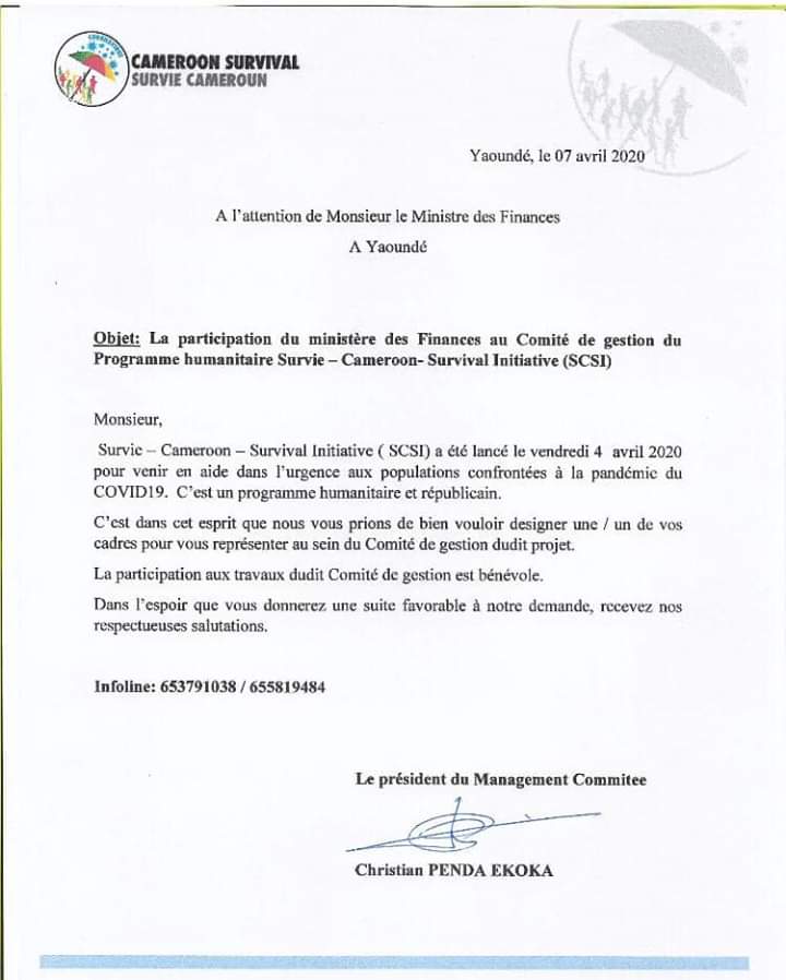 Dans une note signée le mardi 7 avril 2020, le Coordonnateur du SCSI demande au ministre de l’administration territoriale de s’impliquer dans cette initiative. « Nous vous prions de bien vouloir désigner une /un de vos cadres pour vous représenter au sein du comité dudit projet », écrit Christian Penda Ekoka.